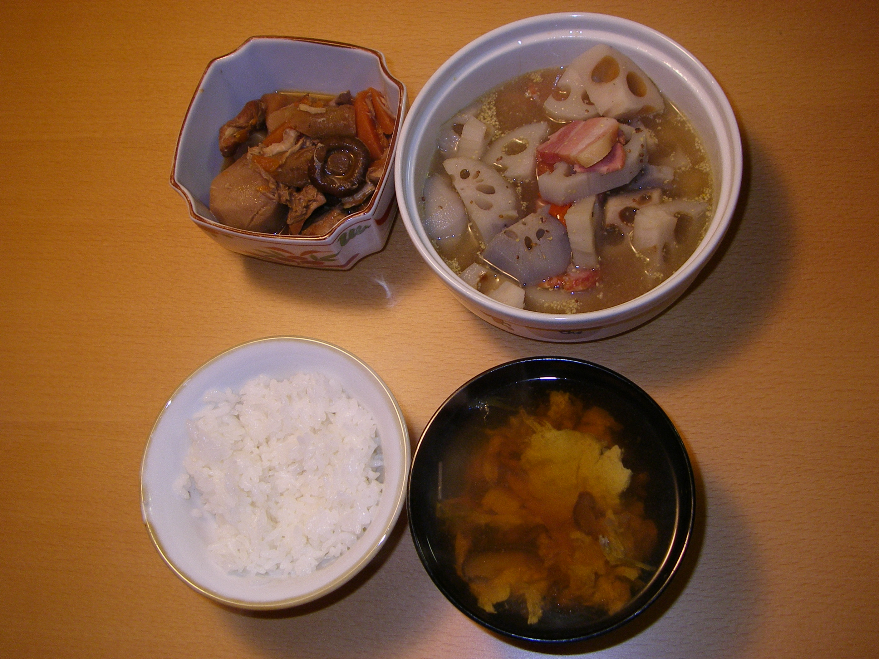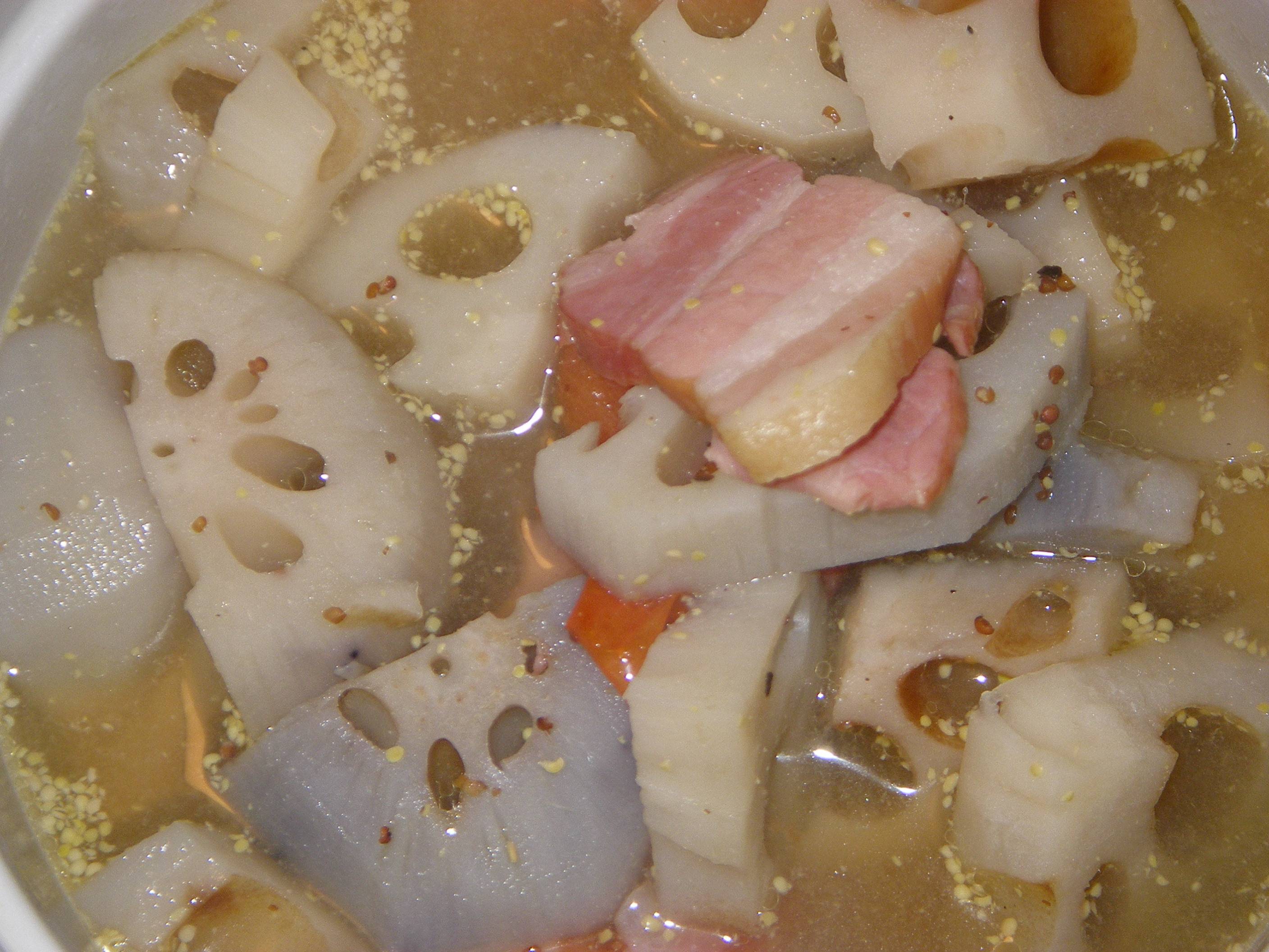④お鍋に水+固形スープの素+レンコン+ベーコンを入れ中火にかける