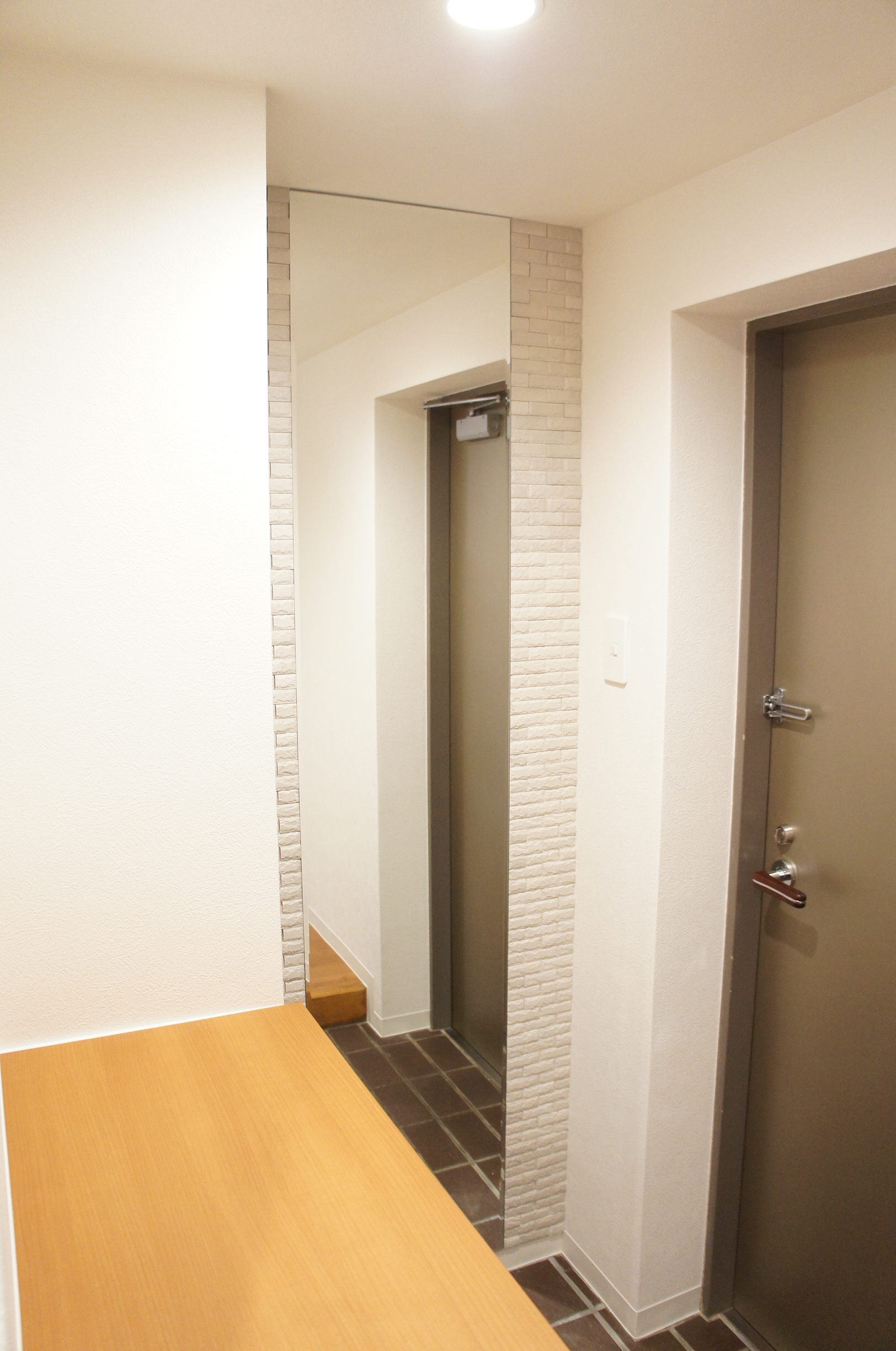さほど広くはない玄関をより広く見せるため、必要以上大きなミラー