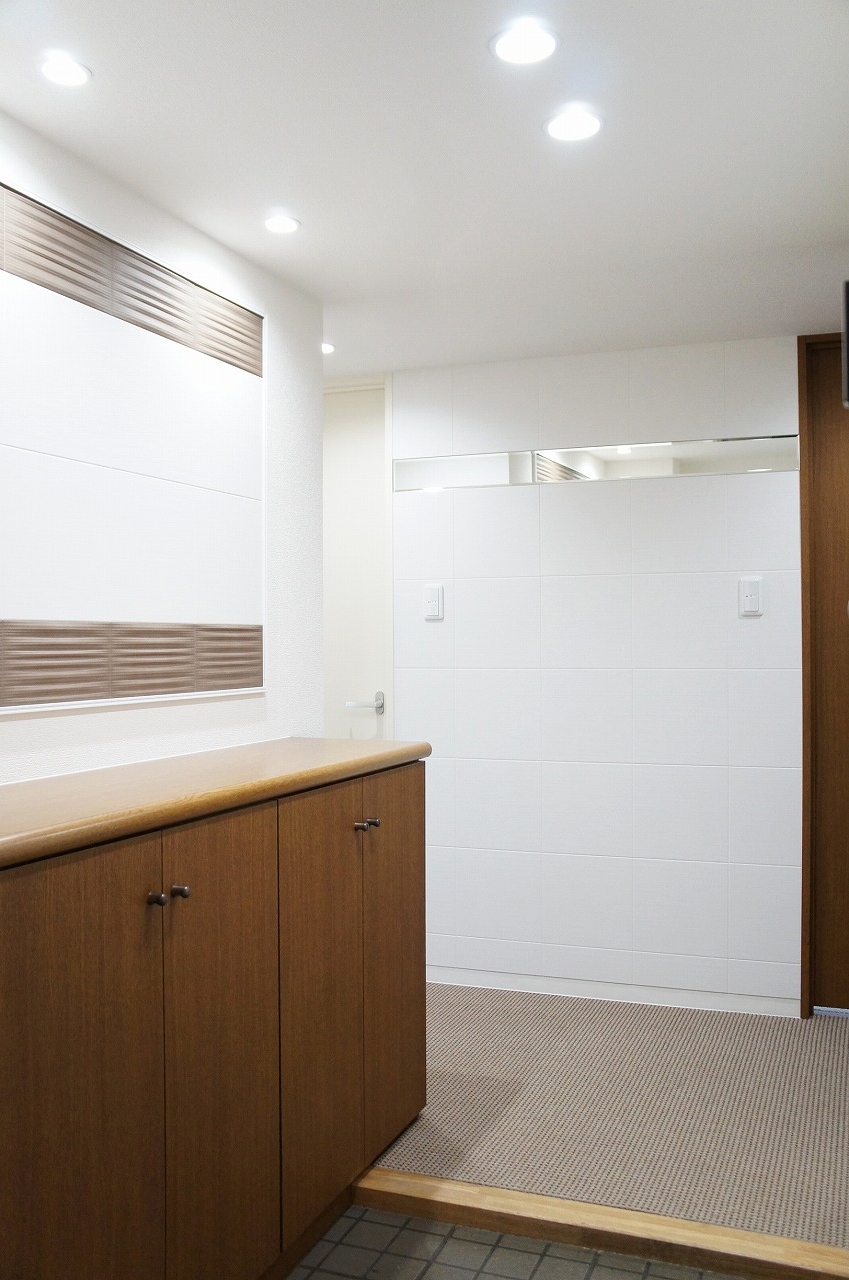 壁面には白いタイルとミラーを貼り、下駄箱上には額縁をつけてタイルを貼りました。