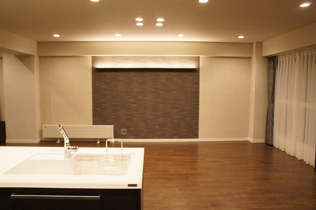 ラピスコーポレーション 竹村です。 昨日に引き続きリビング編です。 リビングの一番広い面を利用してエコカラットを貼りました。上部には間接照明をつけて、見せ場を作りました。 写真でもお分かりの通り、照明器具は天井シーリングから全てダウンライトへ変更しました。